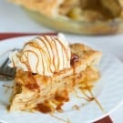 I love how thinly sliced these apples are (I used a mandoline); it’s perfect for piling high and infusing with the salted caramel sauce. When the pie comes out of the oven, that sauce is bubbling and beautiful and smells amazing. Once it cools, it sets up beautifully, with a little bit of caramel sauce seeping out of each piece when it’s plated.